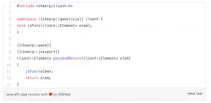 As an experimental prototype of anyref support, we decided to only allow classes defined in the special client namespace to be used in WebAssembly functions: these classes have no layout on the C++ side, only methods. Special methods starting with set_ and get_ are compiled to accesses to the corresponding member fields of the object. Classes declared in this namespace can model existing objects coming from the JavaScript outside of Cheerp, like the native web APIs or a third party JavaScript library.