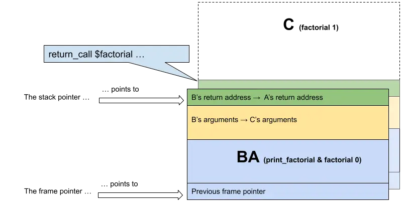 B contains the return_call instruction, so it must be responsible for adapting the stack. We don’t need its frame after it performs a tail call.
