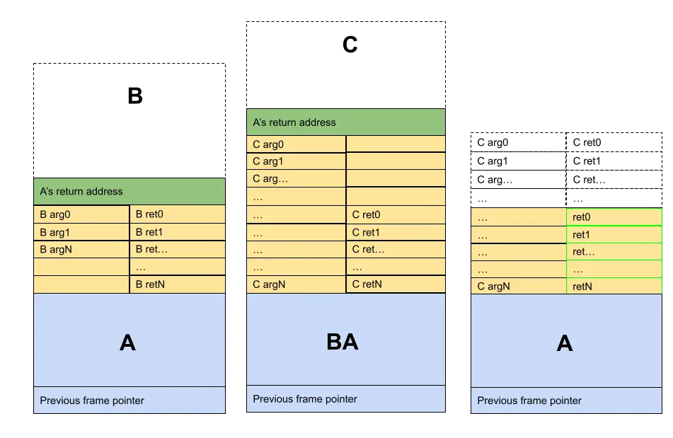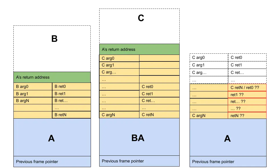 Figure 5. Stack at different stages of the A -> B -> C tail call chain. C*’s number of arguments modified the stack size of* A*. Even if the return count was preserved with* C*’s signature,* A expects the return values at incorrect offsets when C *returns.*