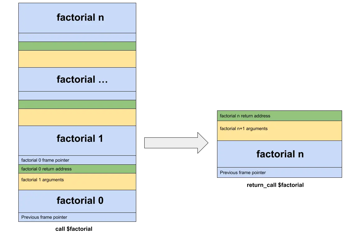 It becomes apparent that with return_call, we only use one frame for factorial and all potential recursions of it.